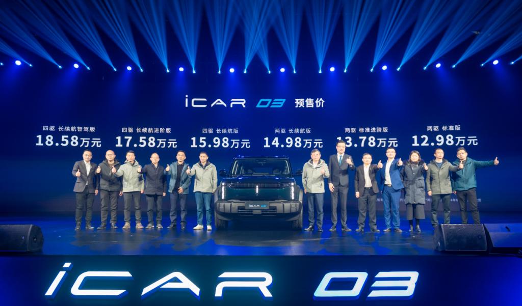 12月18日,“iCAR 03全球預(yù)售發(fā)布暨iCAR零碳智慧工廠開放日”在安徽蕪湖舉行,其中iCAR 03開啟預(yù)售,新車擁有兩驅(qū)和四驅(qū)共6個版型,提供6種外觀車色和2款內(nèi)飾配色選擇,官方預(yù)售價12.98萬元起。