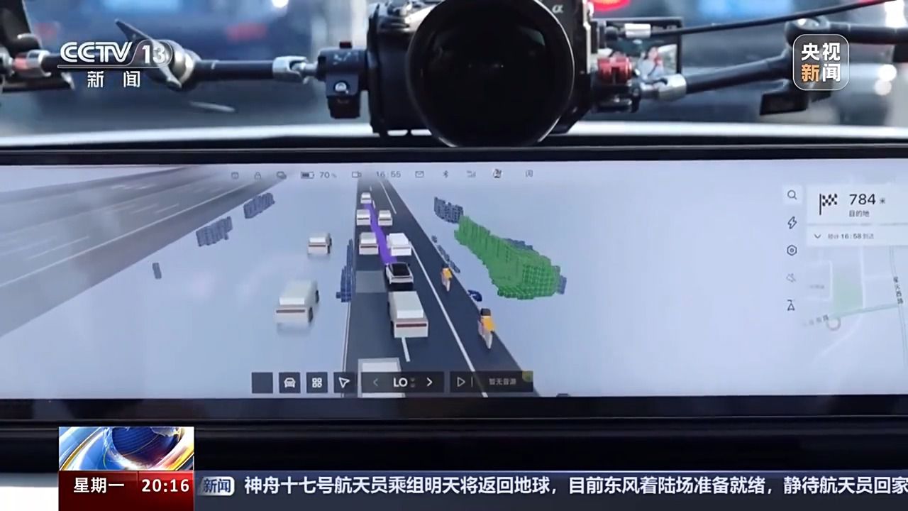 國家智能網聯(lián)汽車創(chuàng)新中心常務副主任 鄭繼虎:汽車產業(yè)上半場是新能源汽車,下半場是智能網聯(lián)汽車,這是全球的一個共識。我們基于車、路、云一體化在做多模態(tài)的整個場景數據庫的構建。 開啟新出行!記者體驗純視覺智能駕駛 如今智能汽車已成為全球汽車產業(yè)發(fā)展的戰(zhàn)略方向。據《全球智能網聯(lián)汽車預測報告(2020—2024)》預測,到今年,全球出貨的新車中超過71%將搭載智能網聯(lián)系統(tǒng),市場正在日趨成熟。智能化出行是什么樣子?在車展舉辦期間,記者就體驗了一次純視覺智能駕駛,給未來出行帶來全新感受。 這臺汽車采用了純視覺智能駕駛方案,不依賴高精地圖,通過高清攝像頭和強大算力,就能更準確地識別周圍環(huán)境,通過大模型技術,能夠帶來全新的智駕體驗。