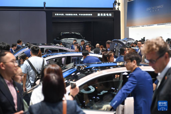 在2024北京車(chē)展上,參觀者在蔚來(lái)汽車(chē)展臺(tái)參觀電動(dòng)汽車(chē)換電站演示。新華社記者鞠煥宗攝