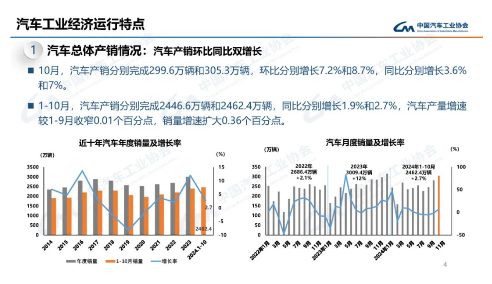 中汽協(xié)發(fā)布數(shù)據(jù)顯示,10月,汽車產(chǎn)銷分別完成299.6萬輛和305.3萬輛,環(huán)比分別增長7.2%和8.7%,同比分別增長3.6%和7%。1-10月,汽車產(chǎn)銷分別完成2446.6萬輛和2462.4萬輛,同比分別增長1.9%和2.7%,汽車產(chǎn)量增速較1-9月收窄0.01個百分點(diǎn),銷量增速擴(kuò)大0.36個百分點(diǎn)。