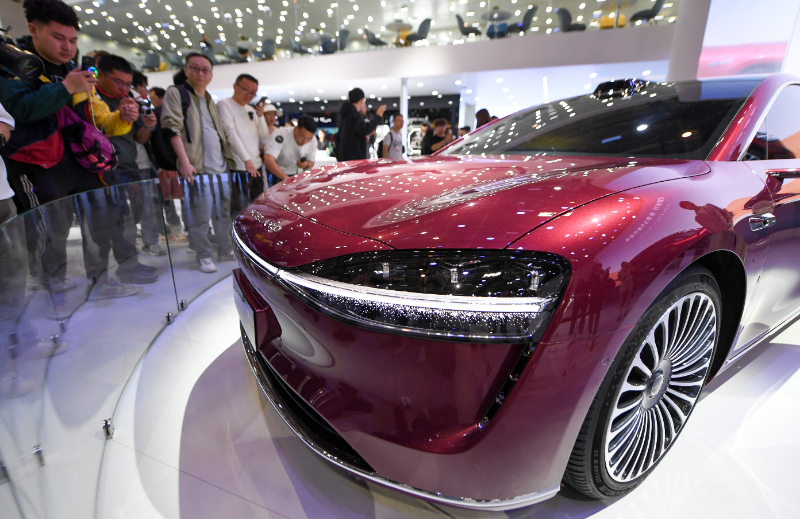(資料圖)2024年4月25日,在北京中國(guó)國(guó)際展覽中心順義館舉行的2024北京車展上,參觀者觀看車展上發(fā)布的新款車型享界S9。新華社記者 鞠煥宗 攝