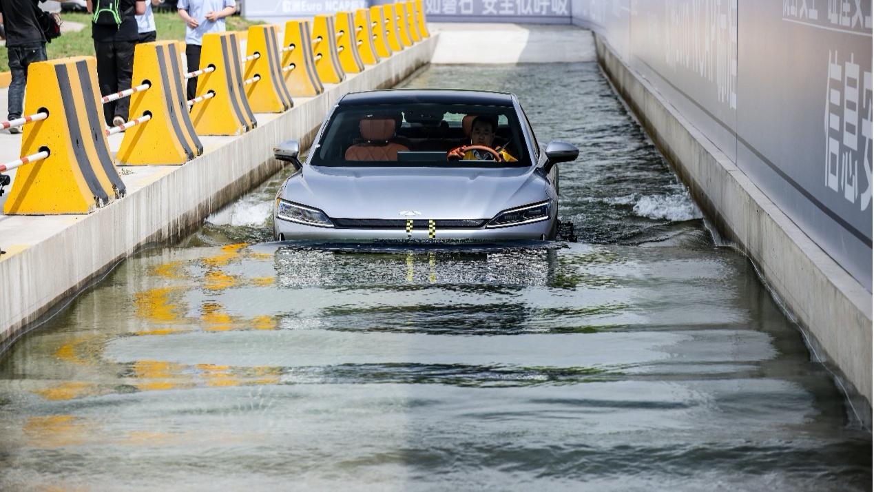 在鐵人三項(xiàng)中,同一輛風(fēng)云A9L模擬極端環(huán)境與事故場(chǎng)景,先經(jīng)過(guò)超越國(guó)家4倍標(biāo)準(zhǔn)的400mm深水區(qū),隨后又以40km/h時(shí)速、40mm重疊量完成刮底實(shí)驗(yàn),并以超越行業(yè)通常做法2.95~3.36倍的55km/h的速度完成中心柱碰。三大實(shí)驗(yàn)后,車輛動(dòng)力系統(tǒng)完整,電池包無(wú)泄漏且絕緣電阻穩(wěn)定在500Ω/V以上。