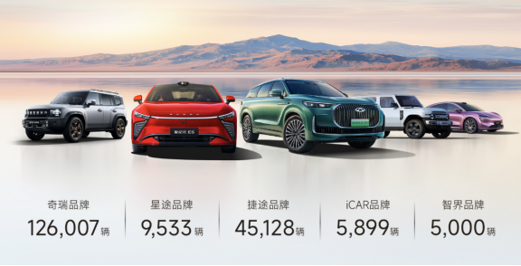 5月份,奇瑞品牌銷售汽車126,007輛,星途品牌銷售汽車9,533輛,捷途品牌銷售汽車45,128輛,iCAR品牌銷售汽車5,899輛,智界品牌銷售汽車5,000輛。