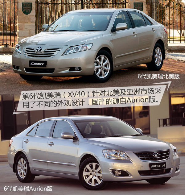 第6代凱美瑞(XV40)誕生于2006年,6月17日正式上市,由廣汽豐田進(jìn)行本土化生產(chǎn)。雖然是豐田的全球化車型,但是XV40針對(duì)北美及亞洲市場(chǎng)采用了不同的外觀設(shè)計(jì)。北美版的車燈更加“鋒利”更加年輕運(yùn)動(dòng),而國產(chǎn)的凱美瑞則采用了更加符合東方審美的亞洲版造型,又被稱作Prestige版或Aurion版。