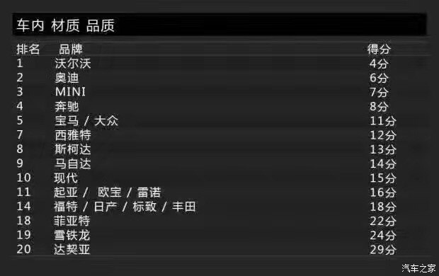 近來把北歐奢華風發(fā)揮至極致的沃爾沃同樣表現(xiàn)不差,在瑞典人注重用料的堅持下得到最多德國人青睞,在所有汽車品牌中滿意度最高。第二名則是奧迪,得分為6分,而MINI竟然贏過奔馳得了第三,寶馬及大眾則列居第五。而滿意度最低的則是達契亞,它的得分為29分。那么問題來了,坐在達契亞里面的車主與活在霾底下的人,誰更幸福?