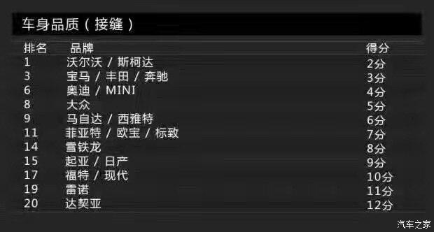Bild調(diào)查的車身品質(zhì)(接縫)主要包括車身品質(zhì)、開關門的手感、鋼板接縫及經(jīng)常與身體接觸的地方。沒錯,這一單項表現(xiàn)最佳的是沃爾沃,得分為2分。這里小編要敲黑板提醒大家注意了:在車身品質(zhì)(接縫)滿意度上,得分最低表現(xiàn)最好。當然,斯柯達也得到了2分,寶馬、奔馳則同為3分。而得分最高的就是前面提到的達契亞,它的得分是12分,換句話說就是達契亞是車身品質(zhì)滿意度最低的品牌。有意思的是與達契亞一起墊底是法系品牌雷諾,它的得分是11分。
