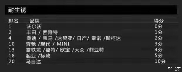 接下來這個項目的得分情況讓小編的心碎了一地,那就是耐生銹品質(zhì)。沃爾沃一如既往的穩(wěn)定,憑借0分的表現(xiàn)力挫群雄,險勝豐田及西雅特這兩個品牌。值得關注的是,這次的倒數(shù)第一名竟換成了馬自達,日系得了10分實屬少見。本來小編就打算入手一臺阿特茲,看到這個表現(xiàn),立馬變得很猶豫了有木有!生銹,生銹,居然生銹?
