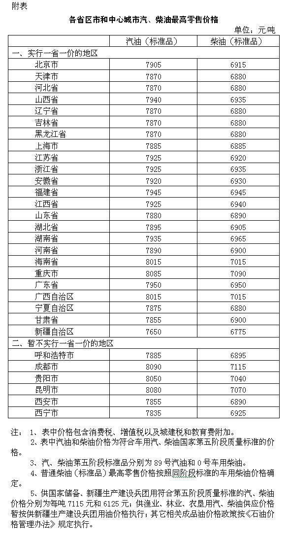 附:各省區(qū)市和中心城市汽、柴油最高零售價(jià)格