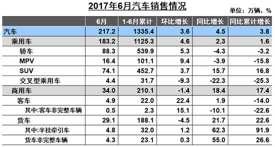 6月,我國(guó)汽車產(chǎn)銷分別為216.7萬輛和217.2萬輛,環(huán)比分別增長(zhǎng)3.9%和3.6%,同比分別增長(zhǎng)5.4%和4.5%。上半年,我國(guó)汽車產(chǎn)銷分別為1352.6萬輛和1335.4萬輛,比上年同期分別增長(zhǎng)4.6%和3.8%,低于上年同期1.9和4.3個(gè)百分點(diǎn)。