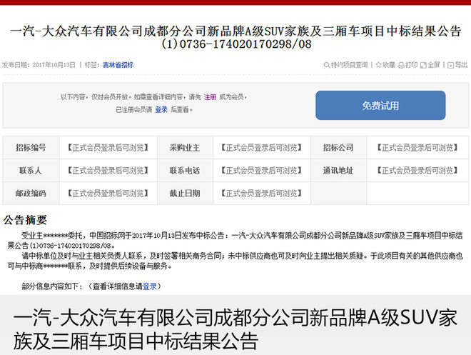 日前,中國(guó)招標(biāo)網(wǎng)正式公布了《一汽-大眾汽車有限公司成都分公司新品牌A級(jí)SUV家族及三廂車項(xiàng)目中標(biāo)結(jié)果公告》從公告上來看,一汽-大眾汽車有限公司正在成都工廠準(zhǔn)備新品牌A級(jí)SUV兩款車型以及另外一款三廂車項(xiàng)目。該項(xiàng)目主要用于投產(chǎn)一汽-大眾全新經(jīng)濟(jì)用車品牌,以滿足消費(fèi)者對(duì)廉價(jià)車的購買需求。