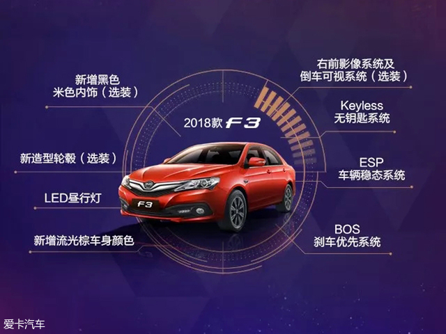 造型方面,2018款比亞迪F3與現(xiàn)款車型保持一致,新車只是在外觀細(xì)節(jié)方面稍作調(diào)整。包括新增名為流光棕的全新車身顏色,并可選裝全新輪圈造型、右前影像系統(tǒng)及倒車影像系統(tǒng)。