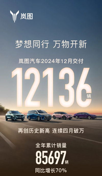 2024年1-12月,嵐圖汽車?yán)塾嫿桓?5697輛,同比增長70%,迸發(fā)出強勁的增長勢能。不僅如此,銷量實現(xiàn)“八連漲”,連續(xù)四個月躋身“萬輛俱樂部”,且產(chǎn)品市場均價穩(wěn)定在35萬元以上,使得嵐圖成為汽車企業(yè)高質(zhì)量發(fā)展的典型代表。作為用戶型科技企業(yè),嵐圖汽車將高質(zhì)量發(fā)展落實到每一處細(xì)節(jié),深度契合新產(chǎn)業(yè)、新業(yè)態(tài)、新模式要求,走出了一條獨具特色且極具示范意義的道路。