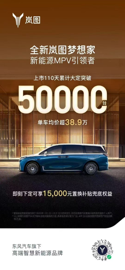 展望未來,嵐圖汽車CEO盧放表示:“2025年將推出4款以上全新或改款車,以更加完善的SUV、轎車和MPV產(chǎn)品布局,進一步滿足廣大用戶的個性化需求。全新嵐圖夢想家將以領(lǐng)先一代的產(chǎn)品力,成為絕對爆款,夯實‘頂流’地位,同時嵐圖繼續(xù)打造更多爆款,全力沖刺全年20萬輛的銷量目標(biāo),為更多用戶提供持續(xù)、穩(wěn)定、靠譜的產(chǎn)品和服務(wù)。”