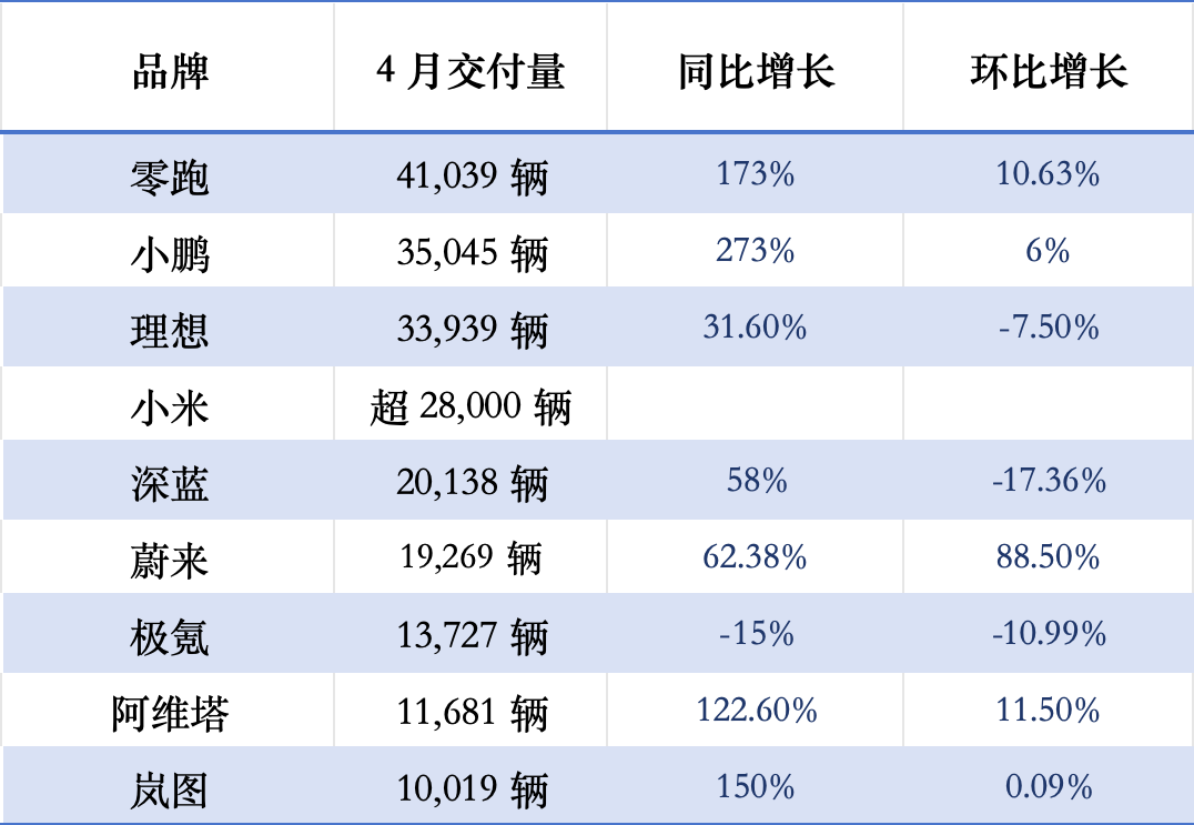 今年以來,零跑、小鵬都保持著較高的增速,4月零跑交付量同比增長達到173%,小鵬同比增長達到273%,理想則保持著31.6%的穩(wěn)定增速。