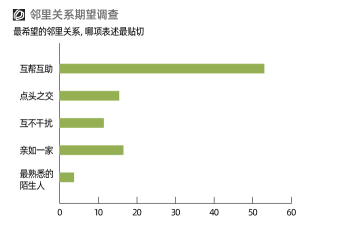除了以上硬件設(shè)施環(huán)境,鄰里關(guān)系這樣的軟性條件也極大影響人們居住質(zhì)量。和“年輕人不愛社交”這樣的普遍認知不同,調(diào)研發(fā)現(xiàn)53%受訪者期待互幫互助的鄰里關(guān)系,更有16.5%的人希望和鄰居親如一家?!斑h親不如近鄰”,在當下依然沒有過時。