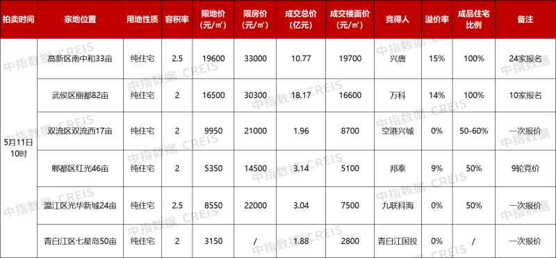 據(jù)中指研究院監(jiān)測,本次出讓中,只有2宗宅地位于主城區(qū),其獲得關注熱度高、參拍企業(yè)多。最終,高新區(qū)南中和33畝宗地和武侯區(qū)麗都82畝宗地價格達到觸頂“熔斷”,分別由興唐地產(chǎn)和萬科以樓面價19700元/平方米、16600元/平方米搖中。