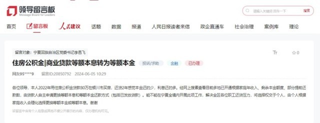 該網(wǎng)友上網(wǎng)查詢得知,目前多地已開(kāi)通還款方式在等額本息與等額本金之間互轉(zhuǎn)的業(yè)務(wù),借款人可自主申請(qǐng)更換等額本息和等額本金還款方式(包括已發(fā)放貸款),希望寧夏相關(guān)部門(mén)也可以開(kāi)展此項(xiàng)工作,解決全區(qū)各位職工還貸壓力。