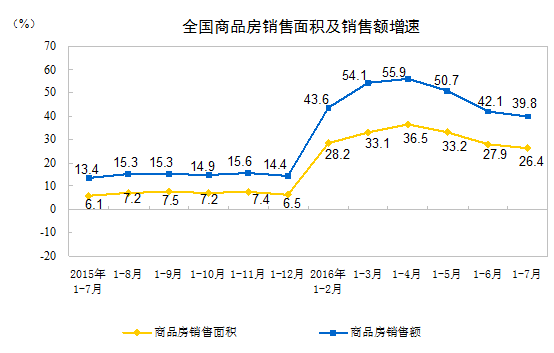 1-7月份,商品房銷售面積75760萬平方米,同比增長26.4%,增速比1-6月份回落1.5個百分點。其中,住宅銷售面積增長26.7%,辦公樓銷售面積增長41.3%,商業(yè)營業(yè)用房銷售面積增長15.5%。商品房銷售額57569億元,增長39.8%,增速回落2.3個百分點。其中,住宅銷售額增長41.2%,辦公樓銷售額增長65.3%,商業(yè)營業(yè)用房銷售額增長17.6%。