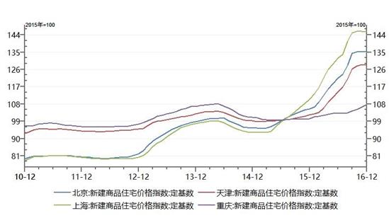 重慶近兩年的房價漲幅明顯低于另外3個直轄市。數(shù)據(jù)來源:Wind資訊