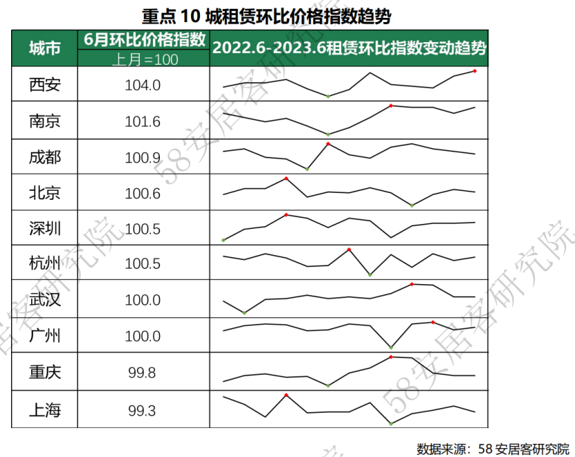 今年上半年,重點10城租賃市場整體呈現(xiàn)出平穩(wěn)復(fù)蘇的態(tài)勢。58同城、安居客《2023年上半年全國租賃市場報告》顯示,重點二線城市的價格表現(xiàn)強于一線城市,部分二線城市租賃價格指數(shù)保持了較好的回升趨勢,如成都、南京、武漢等城市上半年月度環(huán)比價格指數(shù)均呈現(xiàn)小幅溫和上升的趨勢。同時,步入5月夏季畢業(yè)季之后,租賃市場步入旺季,北京、深圳及西安連續(xù)兩個月的環(huán)比價格指數(shù)呈現(xiàn)回升。