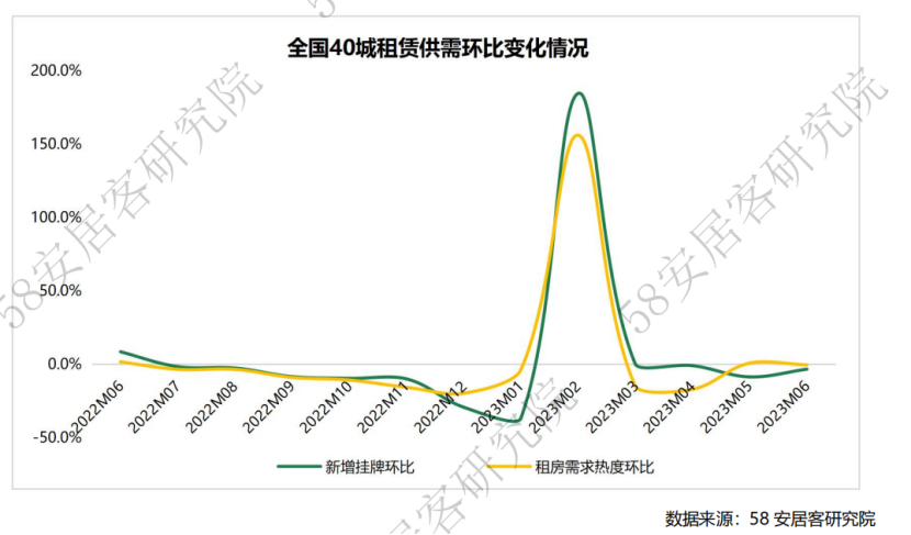今年上半年,全國40城租賃市場供需基本處于同向波動,整體供需表現(xiàn)強于去年下半年。58同城、安居客《2023年上半年全國租賃市場報告》顯示,2月在春節(jié)后復(fù)產(chǎn)復(fù)工熱的帶動下,租賃市場迎來供需兩旺的“小陽春”行情。步入二季度后,隨著市場供需在一季度的集中性釋放,租賃供需趨于回落。5月和6月,租賃市場步入傳統(tǒng)的夏季畢業(yè)求職旺季。