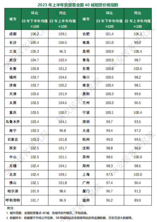 從城市價格表現(xiàn)來看,各城市間的分化差異顯著。58同城、安居客統(tǒng)計顯示,一線城市中,北京的租賃價格環(huán)比及同比均呈現(xiàn)上漲,上海、深圳和廣州較去年下半年租賃價格環(huán)比均呈現(xiàn)小幅下跌。多數(shù)二線城市租賃價格呈現(xiàn)顯著回升,如成都、長沙、武漢、福州、濟(jì)南、太原、烏魯木齊、合肥等城市價格表現(xiàn)相對較好。整體來看,2023年上半年市場普遍迎來復(fù)蘇之勢。