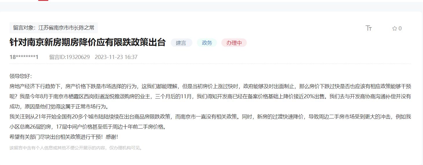 在領(lǐng)導(dǎo)留言板上,11月23日,有網(wǎng)友表示“針對(duì)南京新房期房降價(jià)應(yīng)有限跌政策出臺(tái)”。該網(wǎng)友留言道,“房地產(chǎn)經(jīng)濟(jì)下行趨勢(shì)下,房產(chǎn)價(jià)格下跌是市場(chǎng)選擇的行為,這我們都能理解,但是當(dāng)初房?jī)r(jià)上漲過快時(shí),政府能夠及時(shí)出面制止,那么房?jī)r(jià)下跌過快是否也應(yīng)該有相應(yīng)政策能夠干預(yù)呢?我是今年8月于南京市棲霞區(qū)西崗街道瀧悅雅頌購房的業(yè)主,3個(gè)月后的11月,我們得知開發(fā)商已經(jīng)在備案價(jià)格基礎(chǔ)上降價(jià)接近20%出售。我們?nèi)ヅc開發(fā)商協(xié)商溝通補(bǔ)償并沒有成功,原因是他們覺得這屬于正常市場(chǎng)行為。 我關(guān)注到從21年開始全國有20多個(gè)城市陸陸續(xù)續(xù)在出臺(tái)商品房限跌政策,而南京市一直沒有相關(guān)政策。同時(shí),新房的過度快速降價(jià),導(dǎo)致周邊二手房市場(chǎng)受到更大的沖擊,例如我小區(qū)總高26層的房,17層中間戶價(jià)格甚至低于周邊十年前二手房?jī)r(jià)格?!?/p>