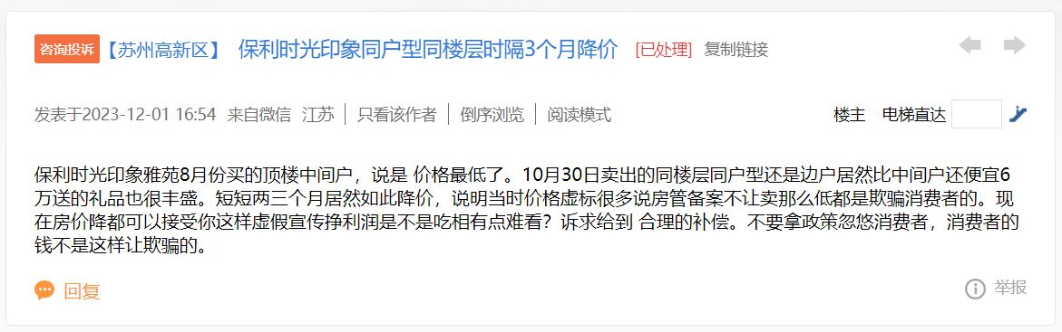 澎湃新聞在蘇州陽光便民網(wǎng)上看到,12月1日,有網(wǎng)友留言表示:蘇州高新區(qū)保利時(shí)光印象雅苑項(xiàng)目,“8月份買的頂樓中間戶,說是價(jià)格最低了。10月30日賣出的同樓層同戶型還是邊戶,居然比中間戶還便宜6萬元,送的禮品也很豐盛。短短兩三個(gè)月居然如此降價(jià),說明當(dāng)時(shí)價(jià)格虛標(biāo)?!?/p>