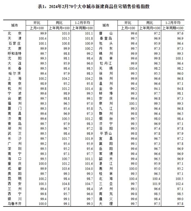 2024年2月70個(gè)大中城市新建商品住宅銷(xiāo)售價(jià)格指數(shù)。 截圖自國(guó)家統(tǒng)計(jì)局官網(wǎng)