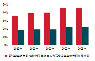 報(bào)告顯示,2023年,百?gòu)?qiáng)企業(yè)銷售總額、銷售面積分別達(dá)53896.0億元、26131.6萬平方米。 百?gòu)?qiáng)企業(yè)市場(chǎng)份額為46.2%,較上年微增0.4個(gè)百分點(diǎn)。