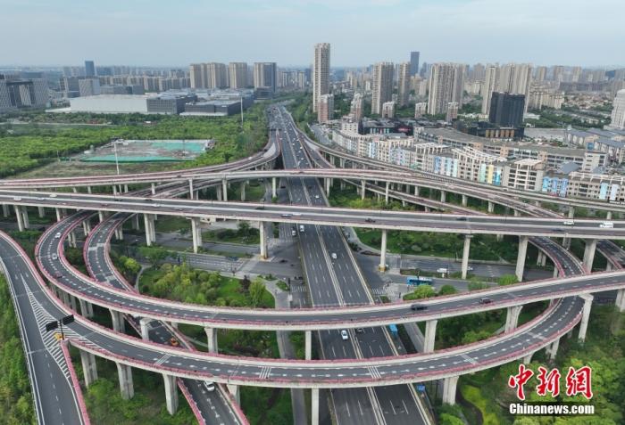 杭州一座高架互通上月季花盛放。(無人機照片)中新社記者 王剛 攝