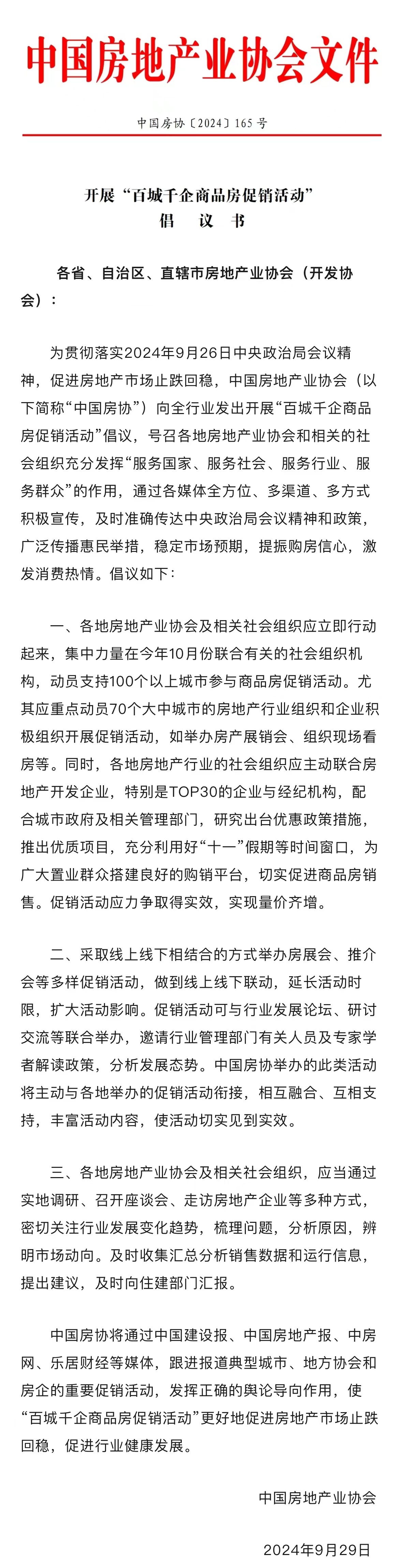 央廣網(wǎng)北京10月11日消息(記者安垚)據(jù)中國房地產(chǎn)業(yè)協(xié)會微信公眾號消息,為貫徹落實(shí)9月26日中央政治局會議精神,促進(jìn)房地產(chǎn)市場止跌回穩(wěn),在住房和城鄉(xiāng)建設(shè)部的指導(dǎo)下,9月29日,中國房地產(chǎn)業(yè)協(xié)會(以下簡稱“中國房協(xié)”)發(fā)出開展“百城千企商品房促銷活動”倡議。