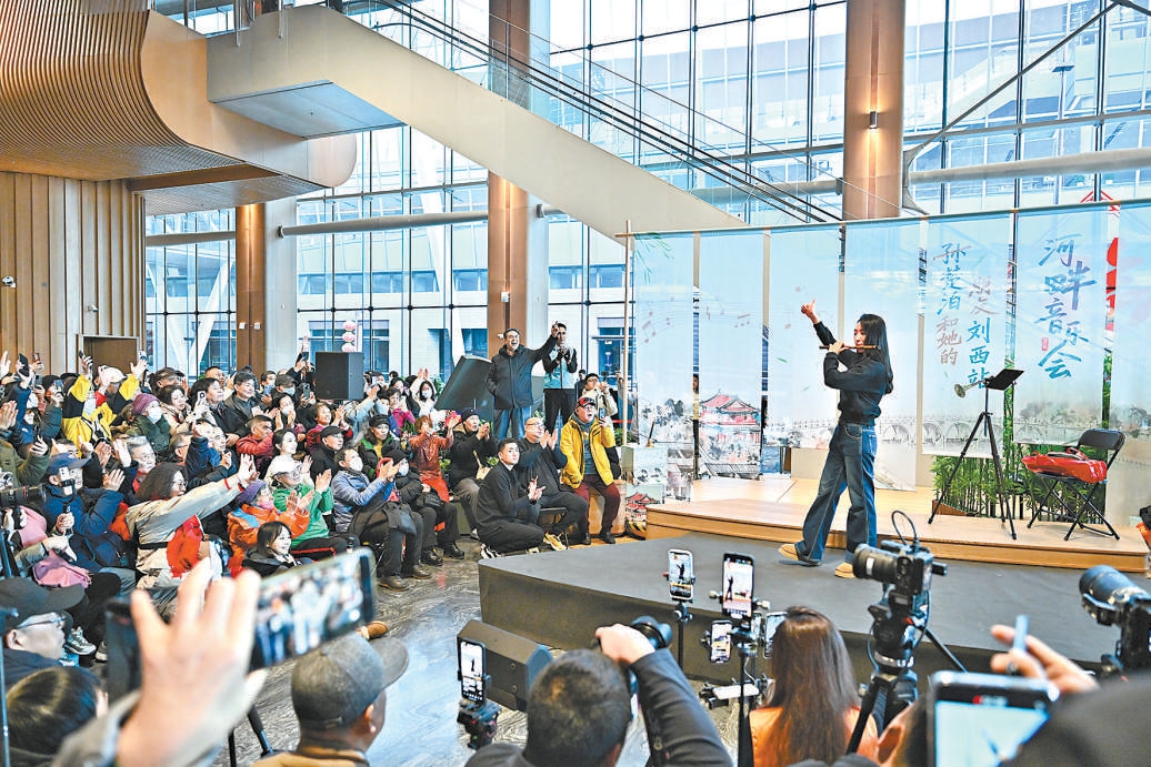 “嗩吶一響,黃金萬兩,新的一年,我給大家添添喜氣?!北本┟褡鍢穲F嗩吶演奏員王向陽熟練地向大家問了聲好。昨天下午,通州區(qū)遠洋樂堤港行人不斷,一段《黃土情》在東區(qū)1層中庭里嘹亮吹響,很快,小舞臺前便里里外外圍了幾層人,還有不少觀眾放慢腳步,從樓上好奇地向下張望:王向陽帶三支嗩吶上臺,《百鳥朝鳳》吹得酣暢淋漓,二胡演奏員孫曉煜弓弦急動,《賽馬》氣勢奔騰,竹笛演奏員蔣錦雯用排簫吹起《月亮代表我的心》,溫柔舒展。約一個小時的演出,喝彩連連,掌聲不斷,周末時光被音樂溫暖點亮。