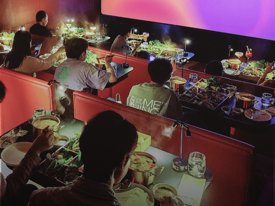 邊吃火鍋邊看電影,不只是在家里才能出現(xiàn)的場景,在三克映畫的電影院同樣能做到?!拔覀兿M麑⑷擞钞嫶蛟斐梢粋€集電影、美食、小型演出以及娛樂活動等為一體的空間。”品牌創(chuàng)始人韓春暉表示,通常情況下,在三克映畫放映的電影與院線同步,不過在和餐飲搭配的電影選擇上,也是有講究的。他說,影院通常會選擇放映一些比較輕松、娛樂性較強的電影。