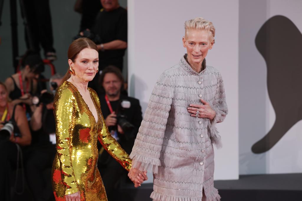 9月2日,在意大利威尼斯舉行的第81屆威尼斯國(guó)際電影節(jié)上,主競(jìng)賽單元影片《隔壁房間》演員朱麗安·摩爾(左)和蒂爾達(dá)·斯文頓亮相首映式紅毯。新華社記者 李京 攝