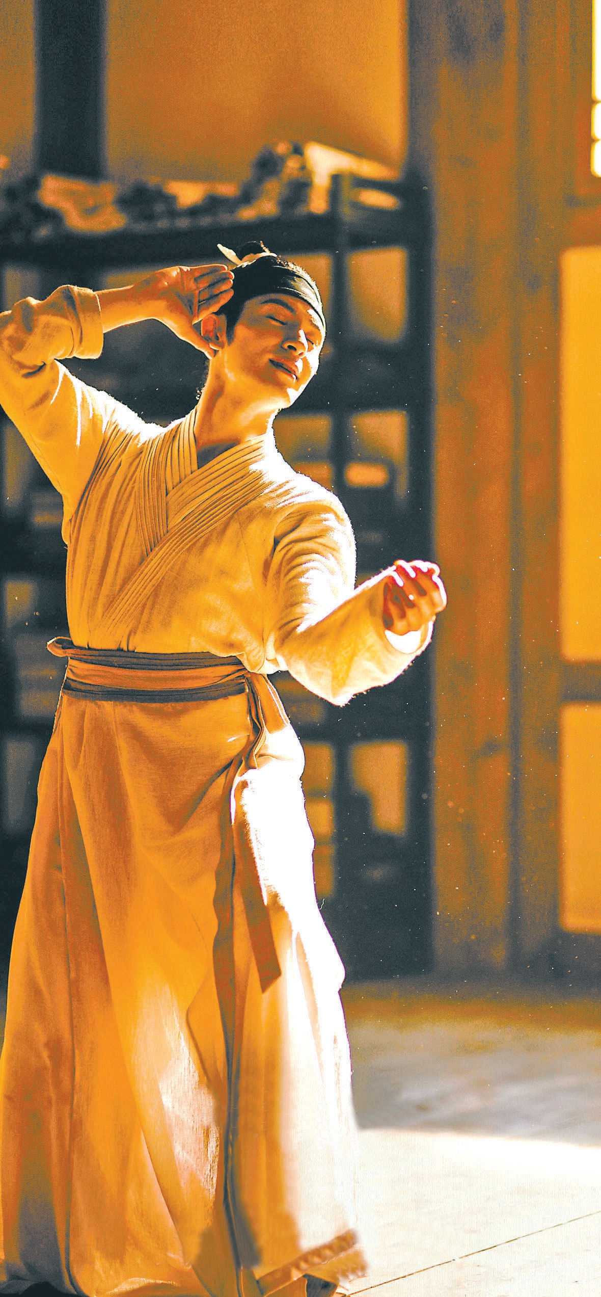 除此之外,《只此青綠》對舞蹈部分的呈現(xiàn)也十分精彩,用近景和特寫捕捉動作細(xì)節(jié),用全景拍攝群舞的整體畫面。故事中情緒激昂的部分,如“問篆”“尋石”“淬墨”三篇,利用傾斜、旋轉(zhuǎn)等特殊景別和運(yùn)鏡來表達(dá)。寫意較多的部分,如“青綠”“入畫”兩篇,用特效輔助畫面,舞者的裙裾在地面上留下青綠墨痕,讓已在畫中靜待千年的色彩瞬間活了起來。此外,高速攝影進(jìn)一步保留了舞者的姿態(tài)和動作細(xì)節(jié)??梢哉f,電影版《只此青綠》充分利用銀幕鏡頭的特性,幫助觀眾更好地欣賞、理解舞蹈,也讓整個故事有了更強(qiáng)的沉浸感。