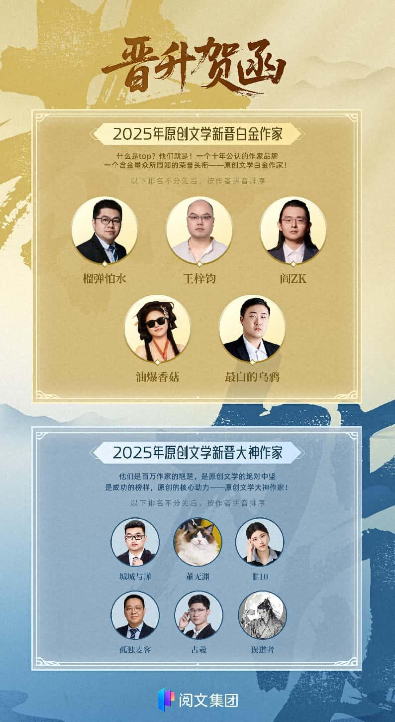 7月15日,閱文集團(tuán)發(fā)布2025年度“白金大神”作家名單,榴彈怕水、王梓鈞、閻ZK、油爆香菇、最白的烏鴉5名作者獲“白金作家”稱(chēng)號(hào),城城與蟬、董無(wú)淵、非10、孤獨(dú)麥客、古羲、誤道者6名作者獲“大神作家”稱(chēng)號(hào)。