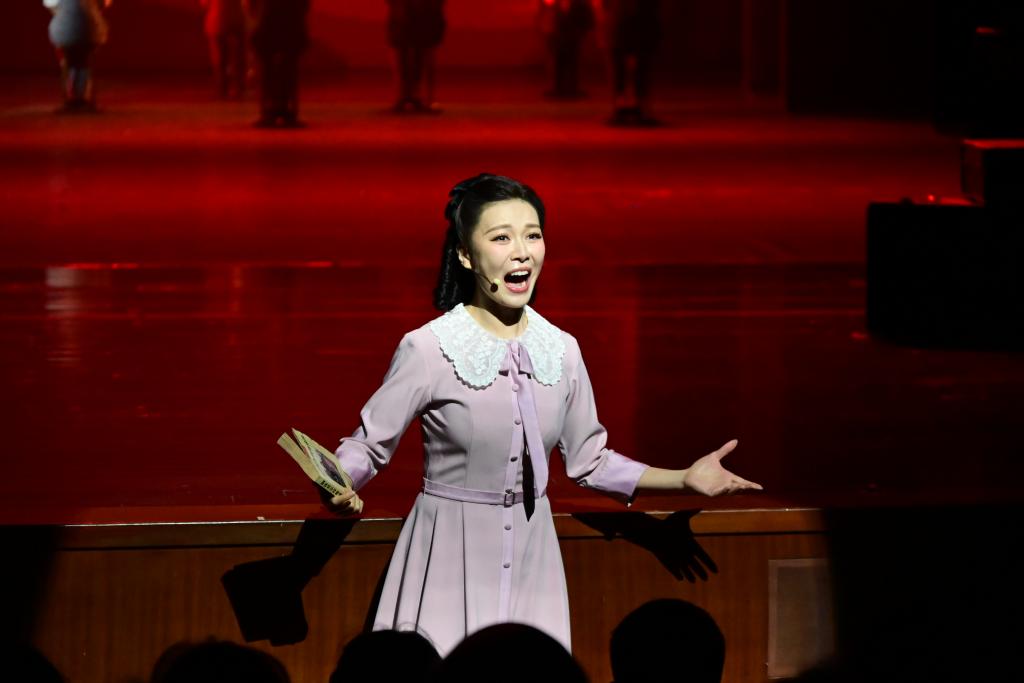 8月2日晚,音樂劇《致青春》在烏魯木齊文化中心大劇院完成謝幕演出。圖為《致青春》劇照。(演出方供圖) 舞臺上,苗族群舞《苗女出嫁》的紅傘如紅云翻涌,芭蕾舞與小合唱交疊,人物命運與悲歡有了更強烈的畫面感。