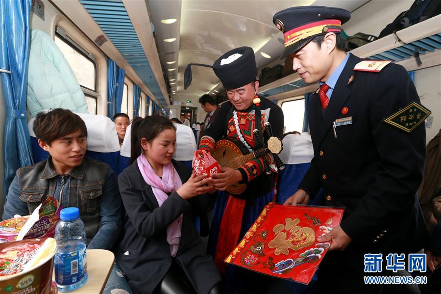 2月1日,彝族藝術(shù)家在K165次列車上為旅客表演。當(dāng)日,在西安鐵路局西安至昆明的K165次列車上,四川美姑縣原生態(tài)畢摩樂隊(duì)與西安客運(yùn)段職工民樂小分隊(duì)聯(lián)合舉辦“英雄列車民族之聲親情溫暖回家路”音樂會(huì),畢摩樂隊(duì)用口弦、哈門、木葉、瑪布等彝族民間樂器演奏的音樂為返鄉(xiāng)過年的旅客提前送上新年祝福。民間藝術(shù)家和列車乘務(wù)員還為旅客們送上“福”字、春聯(lián)。新華社發(fā)