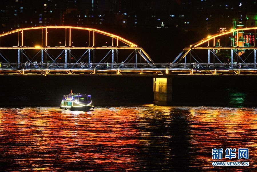 6月14日,一艘游輪從黃河蘭州段中山橋下穿過。自6月12日起,蘭州黃河游輪夏季夜航航線正式開通。據(jù)了解,作為黃河蘭州段水上旅游重點(diǎn)線路,該航線由蘭州市城關(guān)區(qū)蘭州港碼頭和白塔山碼頭始發(fā),每晚20時(shí)起開行,全程約6公里,運(yùn)行時(shí)長50分鐘左右。游客可以乘坐豪華游輪欣賞黃河夜景,感受蘭州黃河風(fēng)情線別樣魅力。新華社記者 陳斌 攝