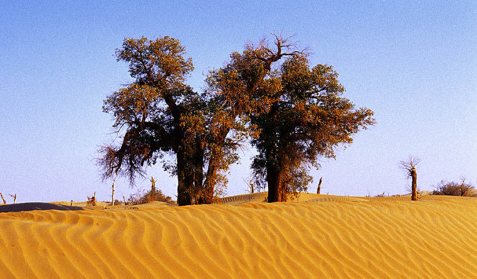 胡楊林是塔里木河流域典型的荒漠森林草甸植被類型,從上游河谷到下游河床均有分布。雖然胡楊林結(jié)構(gòu)相對(duì)簡(jiǎn)單,但具有很強(qiáng)的地帶性生態(tài)烙印。無(wú)論是朝霞映染,還是身披夕陽(yáng),它在給人以神秘感的同時(shí),也讓人解讀到生機(jī)與希望。據(jù)有關(guān)資料顯示,人們還夸贊胡楊巨大的生命力是“三個(gè)一千年”,即活著一千年不死,死后一千年不倒,倒后一千年不朽。