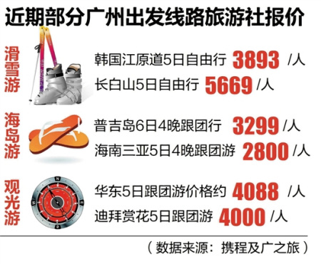 數(shù)據(jù)顯示,越來越多的出境游線路和國內(nèi)游價格相差無幾,不少線路更是“平到笑”。比如,羊城晚報記者根據(jù)攜程及廣之旅報價發(fā)現(xiàn),近期一些廣州出發(fā)到韓國滑雪自由行5日價格為3893元,而到長白山滑雪5日行的價格為5669元;廣州到三亞與到泰國普吉島海島游自由行價格均為3000元左右;廣州到迪拜5日賞花游跟團游4000元,廣州到華東5日跟團游4088元;廣州到越南、柬埔寨出境線路跟團游普遍只需兩三千元,低過不少國內(nèi)游線路。