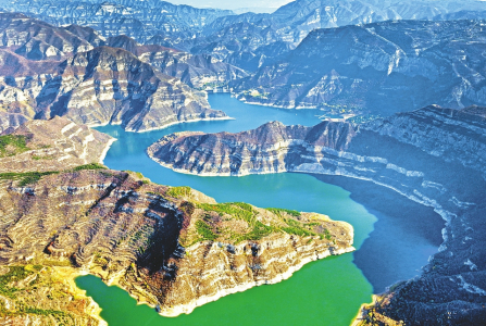 10月21日,在太原汾河二庫風景區(qū),群山環(huán)繞于曲折迂回的水庫周圍,雄險奇秀,水清柔碧綠。如畫山水間,獨特的峽谷風光十分壯觀。