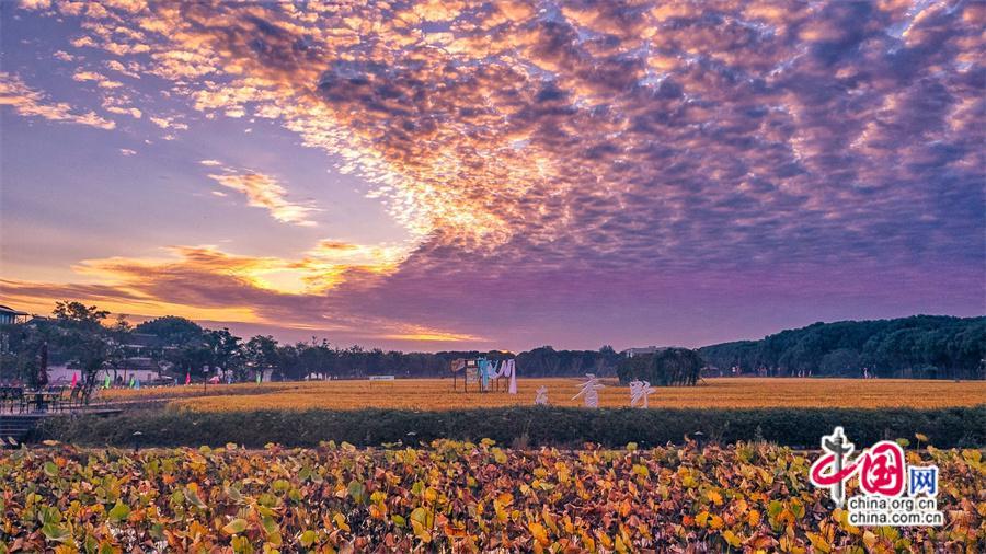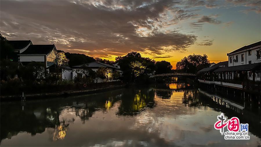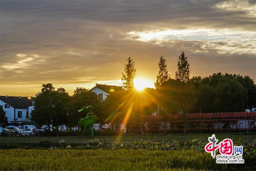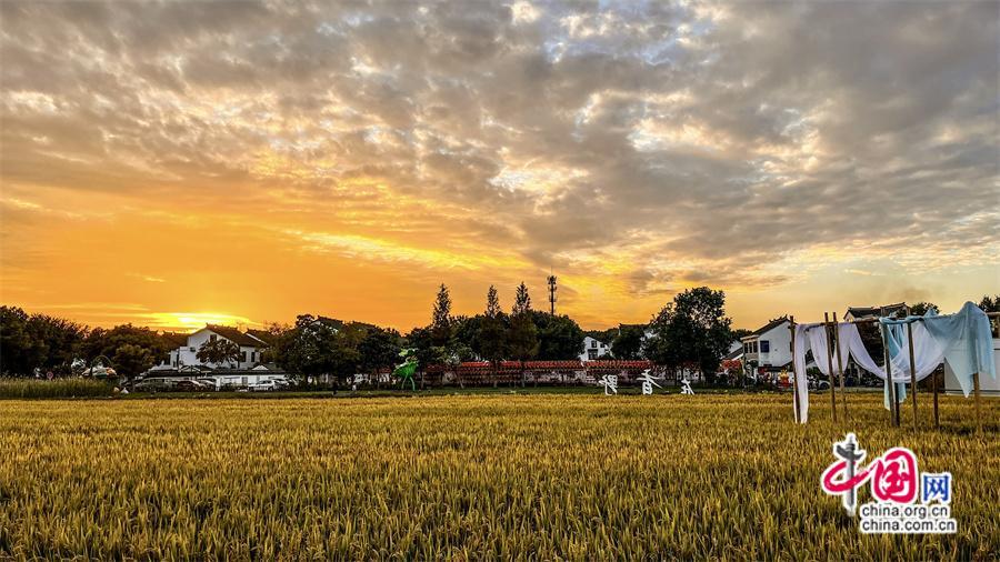 傍晚時分抵達(dá)香村,收獲了一場驚艷的落日美景,云層色彩在光線折射下不斷變化,忽而紅如火,忽而燦如金,忽而粉如煙,再到最后一抹落日的余暉撒遍整個村莊,稻田村舍,樹木小花,一切都籠罩在一片祥瑞的金光里,如夢似幻……這應(yīng)是我見到過的最美江南晚霞。