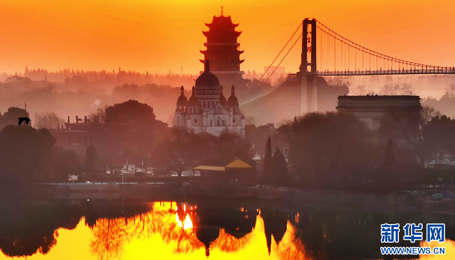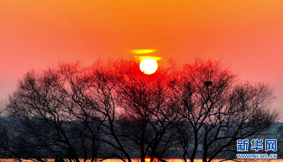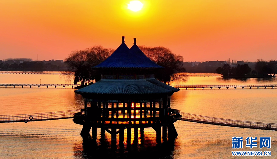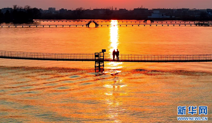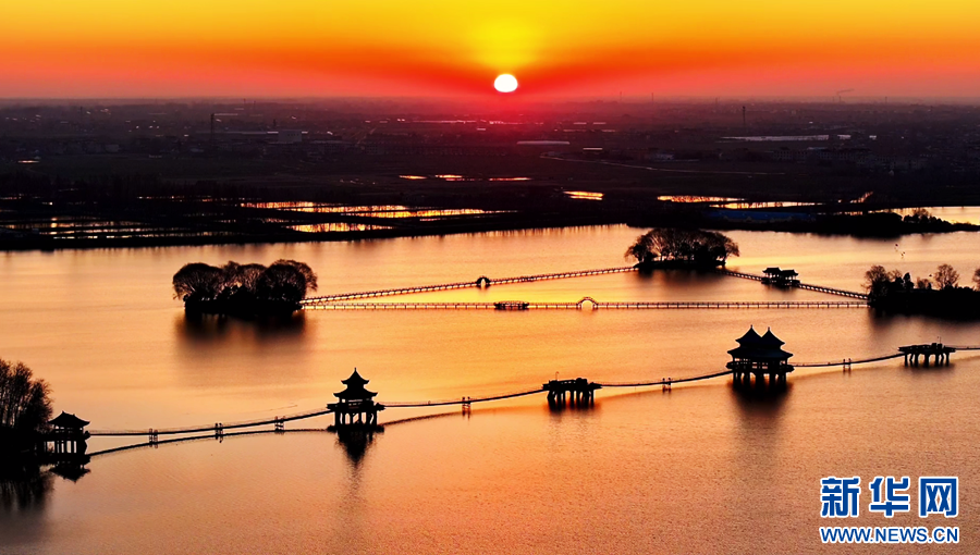 近日,在安徽省潁上縣八里河風(fēng)景區(qū),隨著紅日冉冉升起,晨曦映照在水面上,水光瀲滟,交相輝映,宛如油畫一般,盡顯光影之美。新華網(wǎng)發(fā)(徐紅梅 攝)