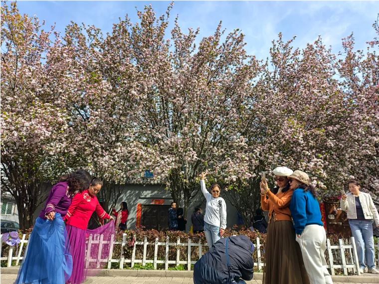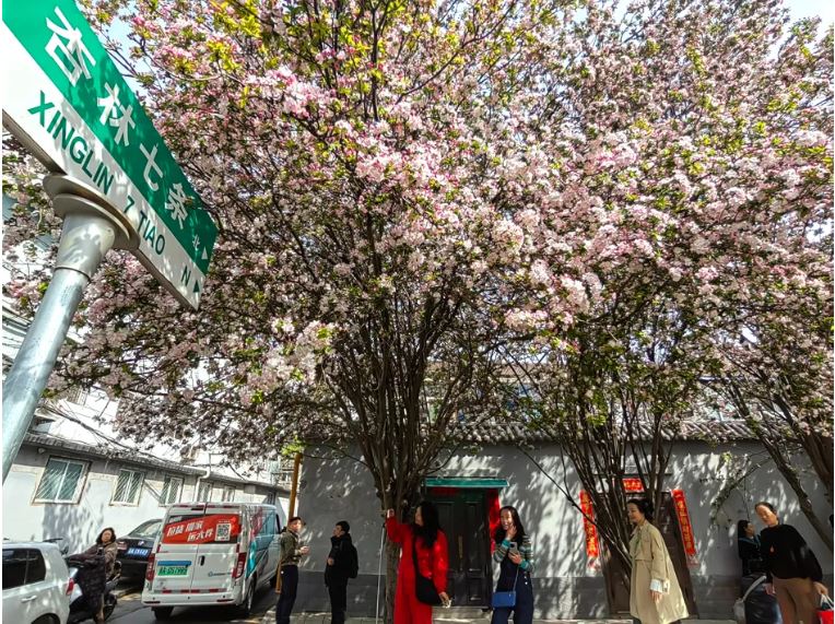 “一朵海棠露春芳,一樹(shù)海棠春滿堂?!薄斑@個(gè)路牌也太春天了吧,趁著春光明媚,帶上相機(jī)來(lái)打卡吧?!薄斑@幾天,這里成了最浪漫的打卡地,喜歡拍照的,趕快去吧!”杏林七條海棠花綻放,從去年海棠盛開(kāi)時(shí)就火爆出圈,幾十米長(zhǎng)的小巷總能看到游人如織的場(chǎng)景,這處隱匿在鬧市中的花海如此熱鬧,許多市民都是看到短視頻后慕名而來(lái),希望與這片美麗花海來(lái)一次親密接觸。