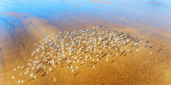 一群海鷗掠過金沙灘,為海面帶來了生機和活力。新華網(wǎng)發(fā)(陳光金 攝)