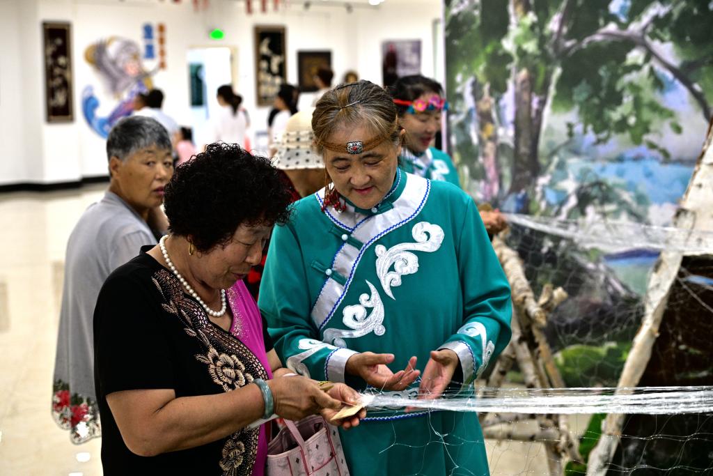 同江市非物質文化遺產(chǎn)展示館內,身穿民族服飾的赫哲族居民向游客介紹赫哲族傳統(tǒng)技藝。新華社記者 丁赫 攝