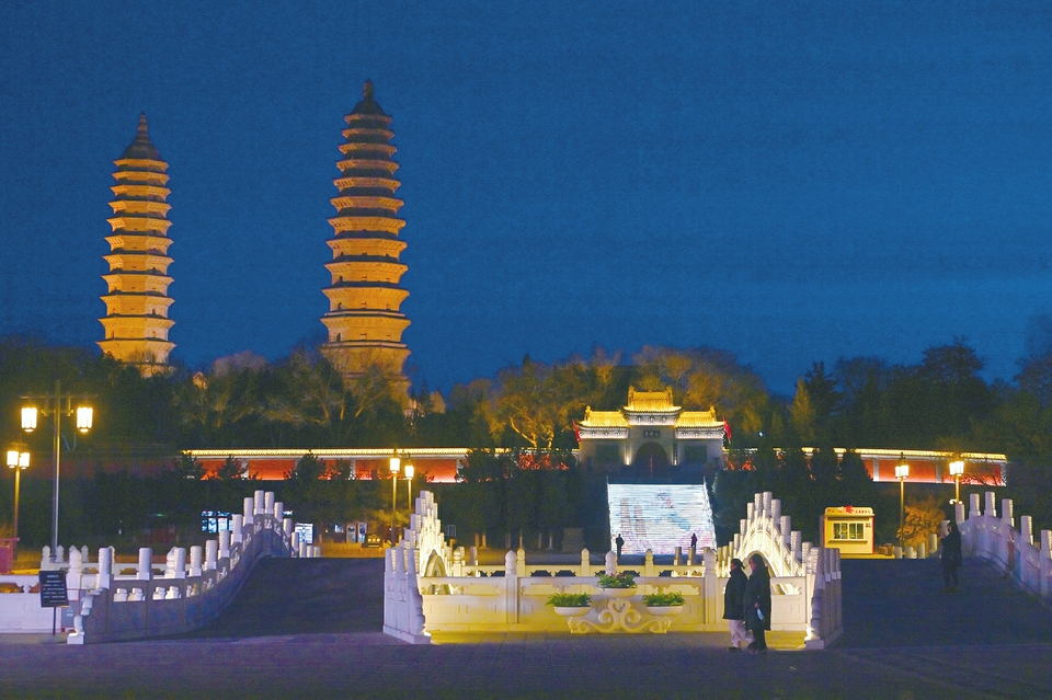 2月8日,夜幕下的太原雙塔公園燈光璀璨,美不勝收。古建筑與現(xiàn)代科技融合,盡顯北方園林的獨特韻味,令游客流連忘返。