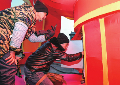 工作人員在巡查花燈電路,確保電力運行穩(wěn)定。